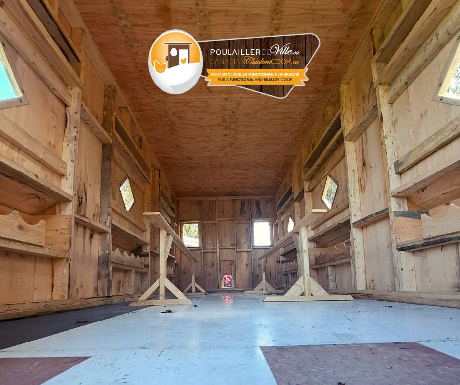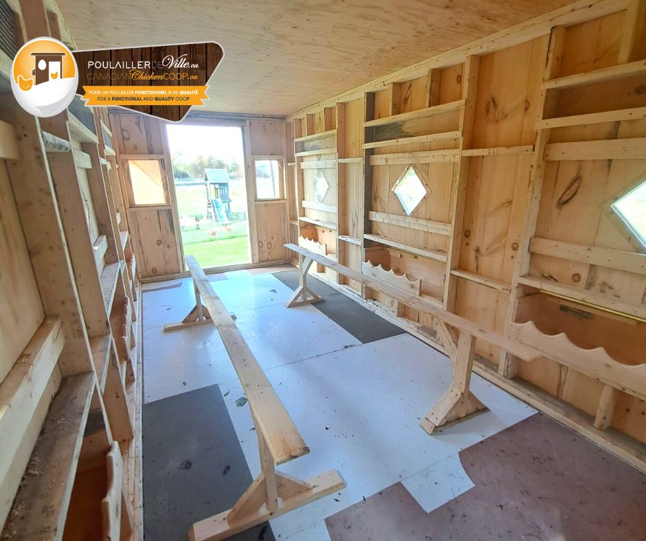 Poulailler de 72″ x 60″ sans enclos. Ce modèle, dont plusieurs clients y ont ajouté un nid, offre un habitacle de 38.5′ carrés + 2 perchoirs amovibles. Ce qui en fait un poulailler très spacieux.